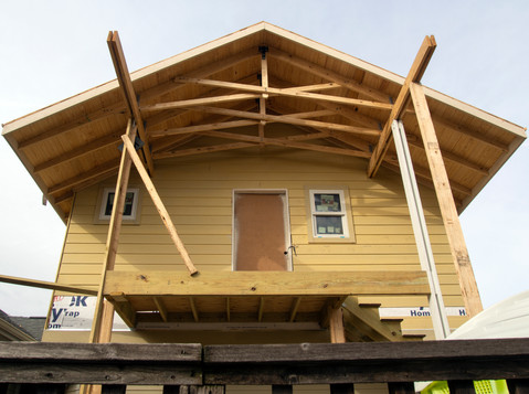 The structure is open and airy. The center posts and bottom chords of the trusses are delicate 2"x4"s. Supporting them, the columns and beams are built up of two 2"x members with space between, which gives a lighter feel than solid wood. Those long extensions of the beams ultimately will be cut off even with the fascia above.